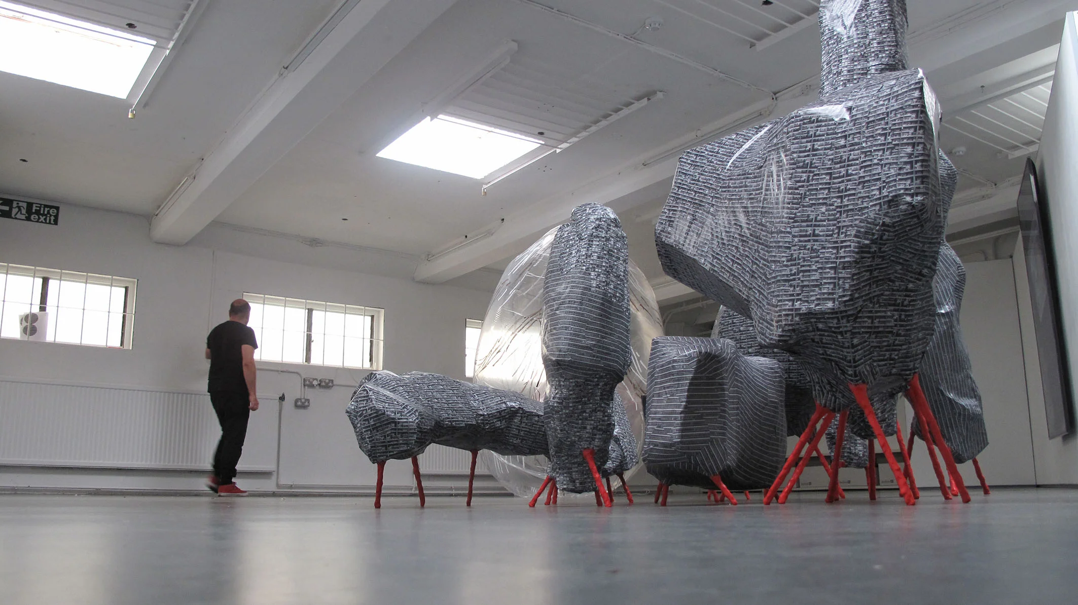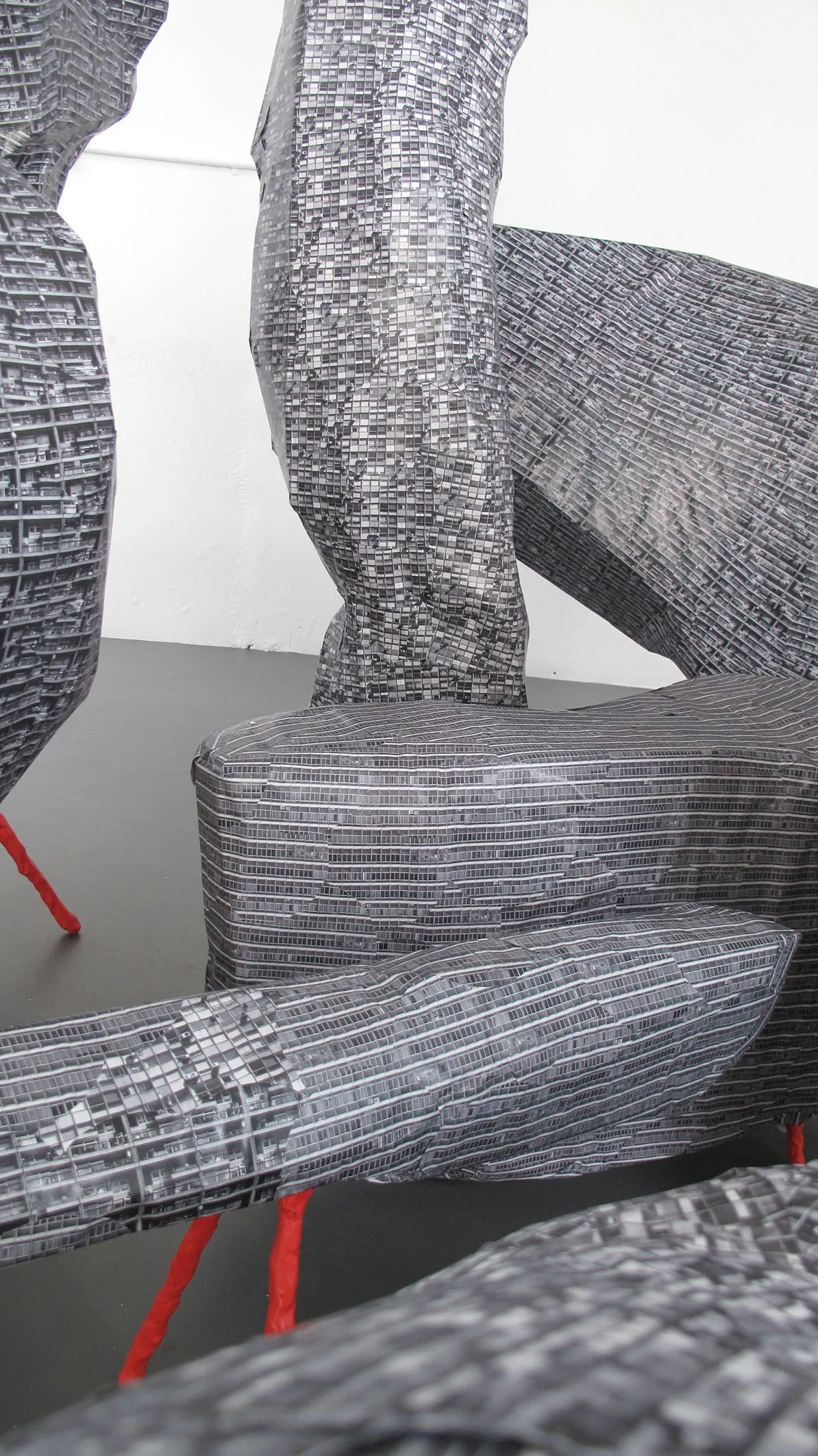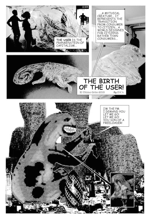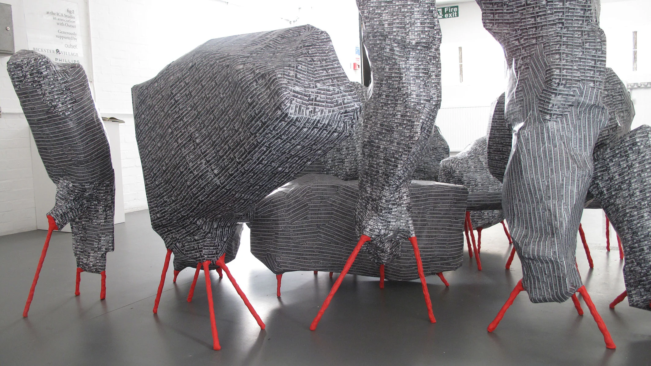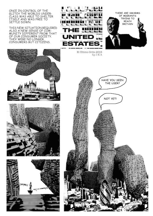 These architectural paradigms (fashions) are temporal but internationally uniform, and part of El Ultimo Grito’s method in their week was to render a number of different but recognisable styles together to create the forms and surfaces of a single United Estates conflated from images of London’s ‘iconic’ Brutalist housing block Trellick Tower, other buildings in Montevideo, and London housing estates. The United Estates sprang up over the week as a number of structures representing a glitched dystopic city that you can’t live in, just as you can’t live in a city without housing or a country refusing to accept immigrants.