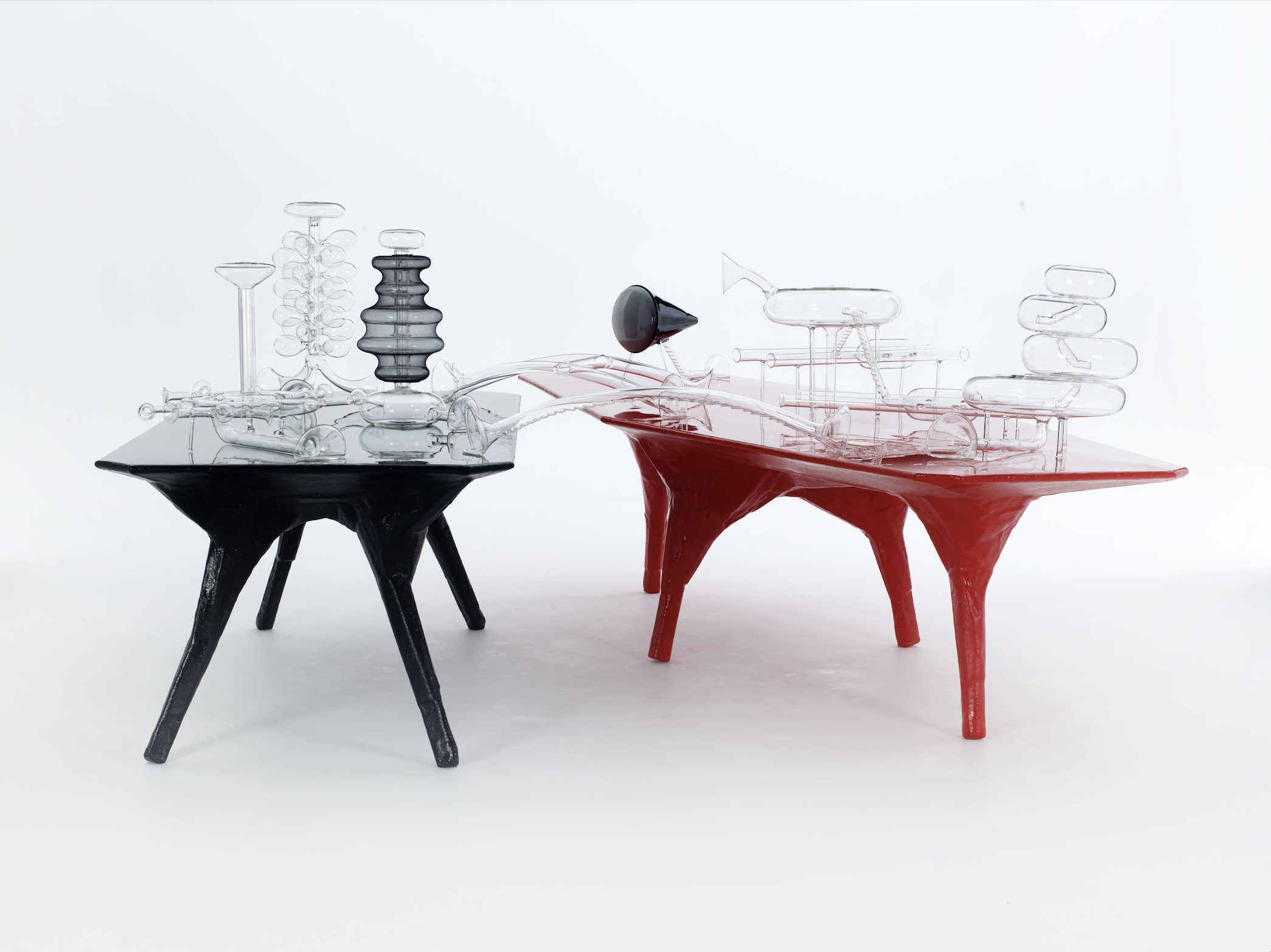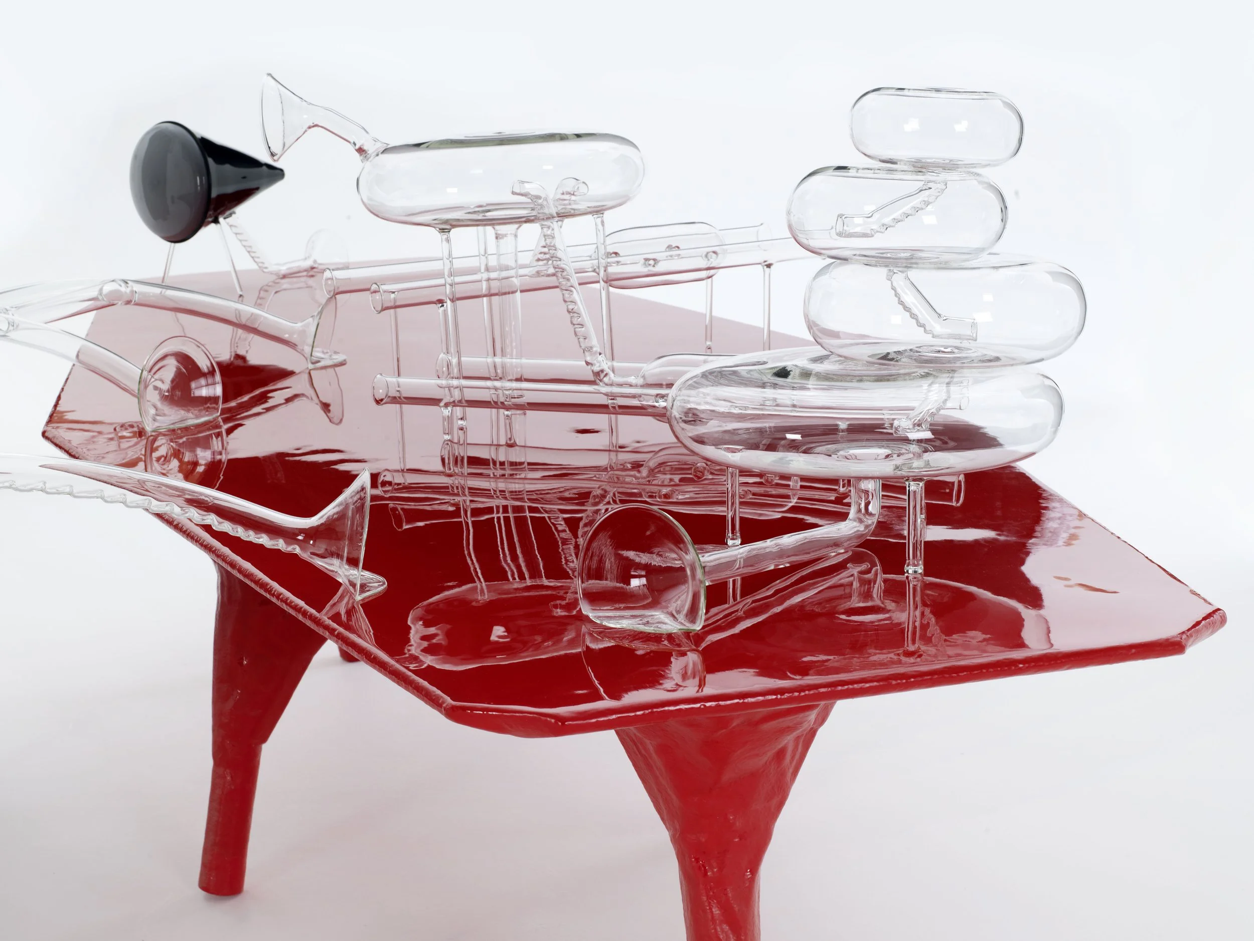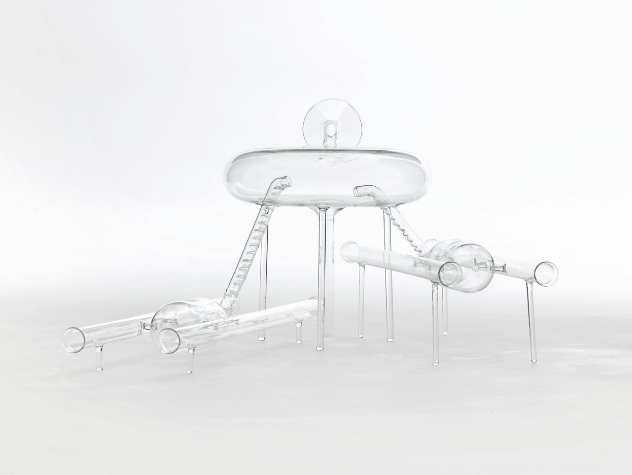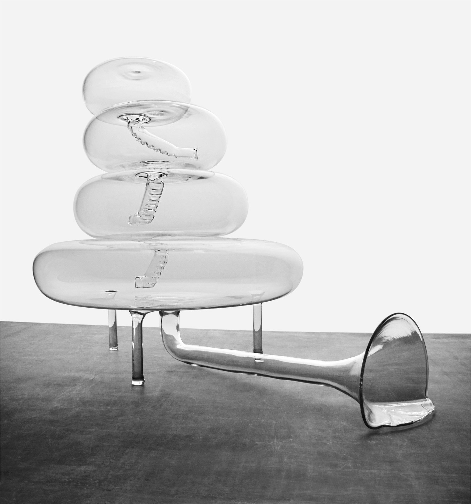 The polished surfaces of the Free Range fibreglass tables use cardboard as the base construction material to form non-geometric, organic-like furniture and are coated (as if dipped) in fibreglass. In this exhibtion they act as the foundation for an elegant sprawl of delicately formed glass objects that create an urban vista. Cinema, Airport, Love Hotel, House and Station. These Imaginary Architectures are propositions for the social, material and spiritual elements of cities. The glass 'buildings' are connected by 'glass bridges' inspired by Venice. These architectures are 'structures of anything', 'imaginary vehicles' familiar enough to be understood yet allowing us to probe, question and speculate upon the relevance and meaning of these spaces in our lives.