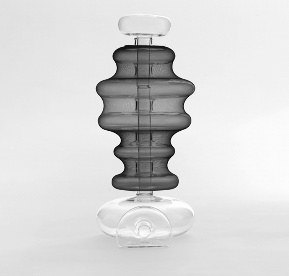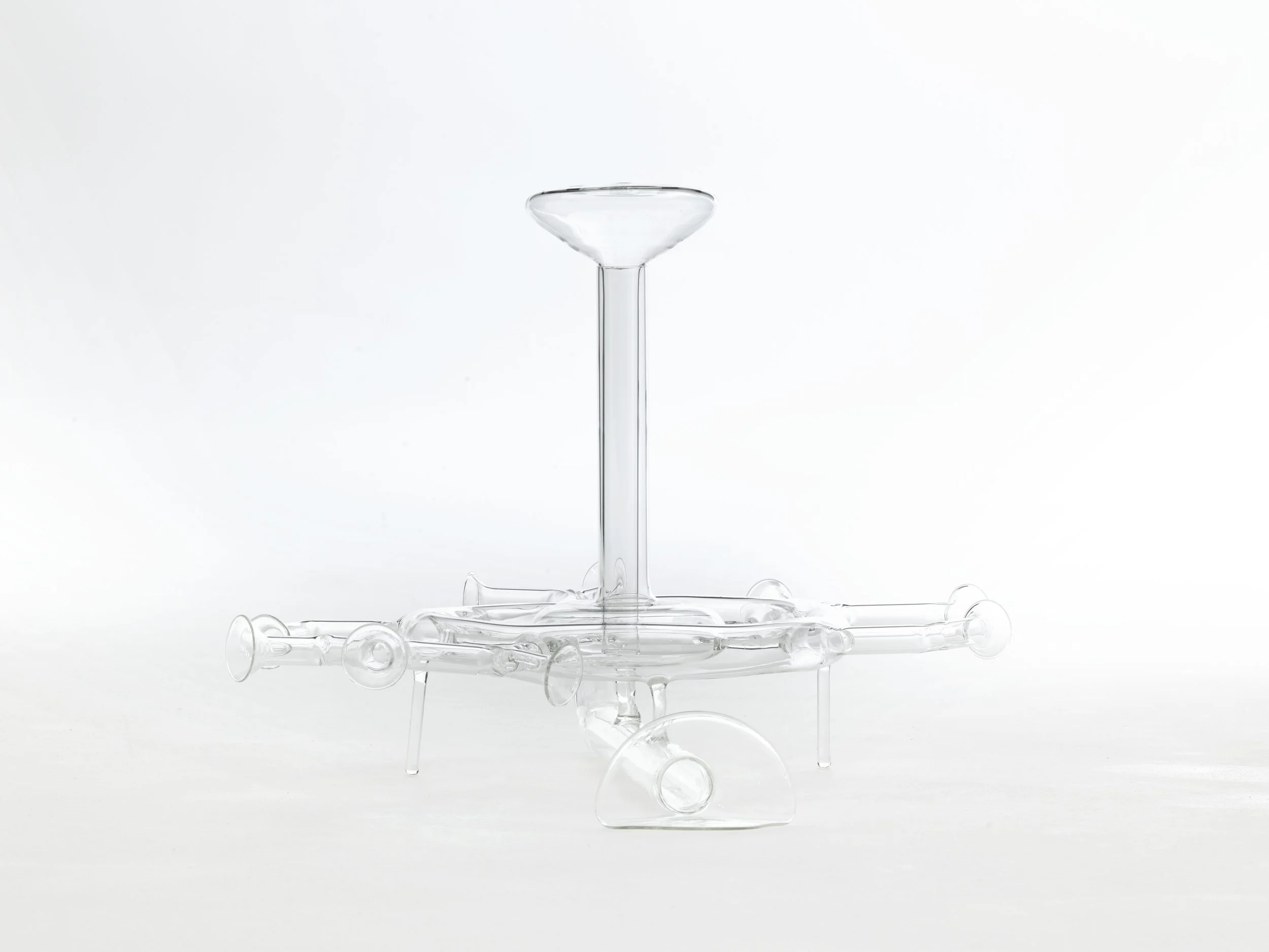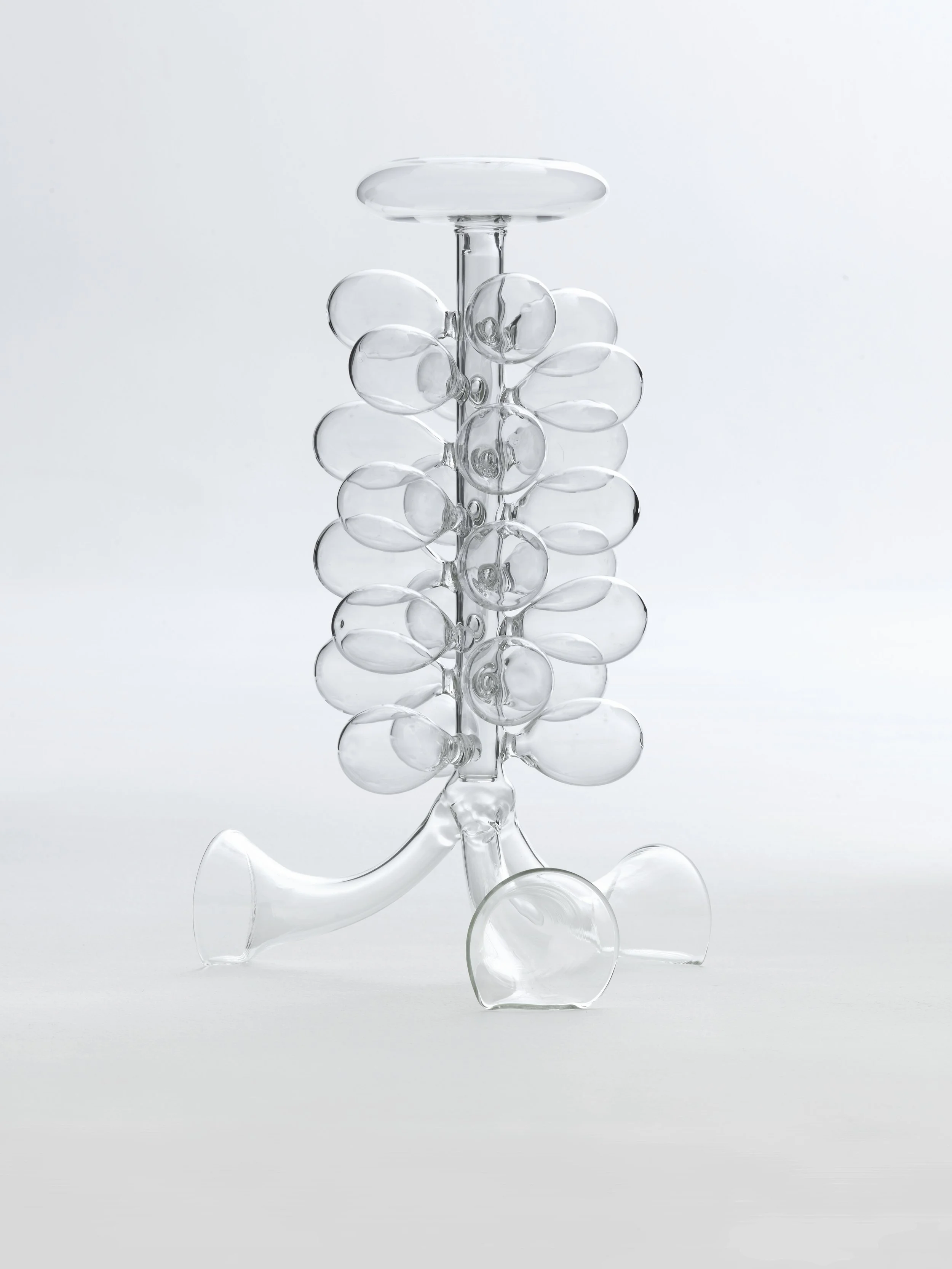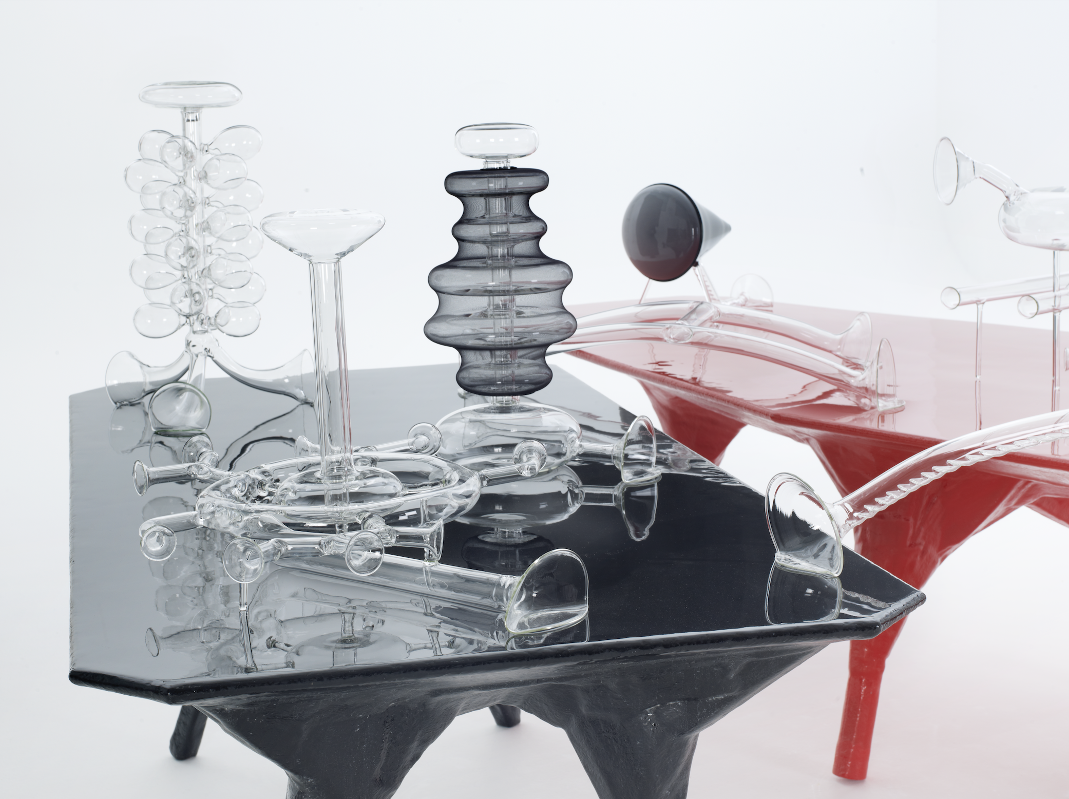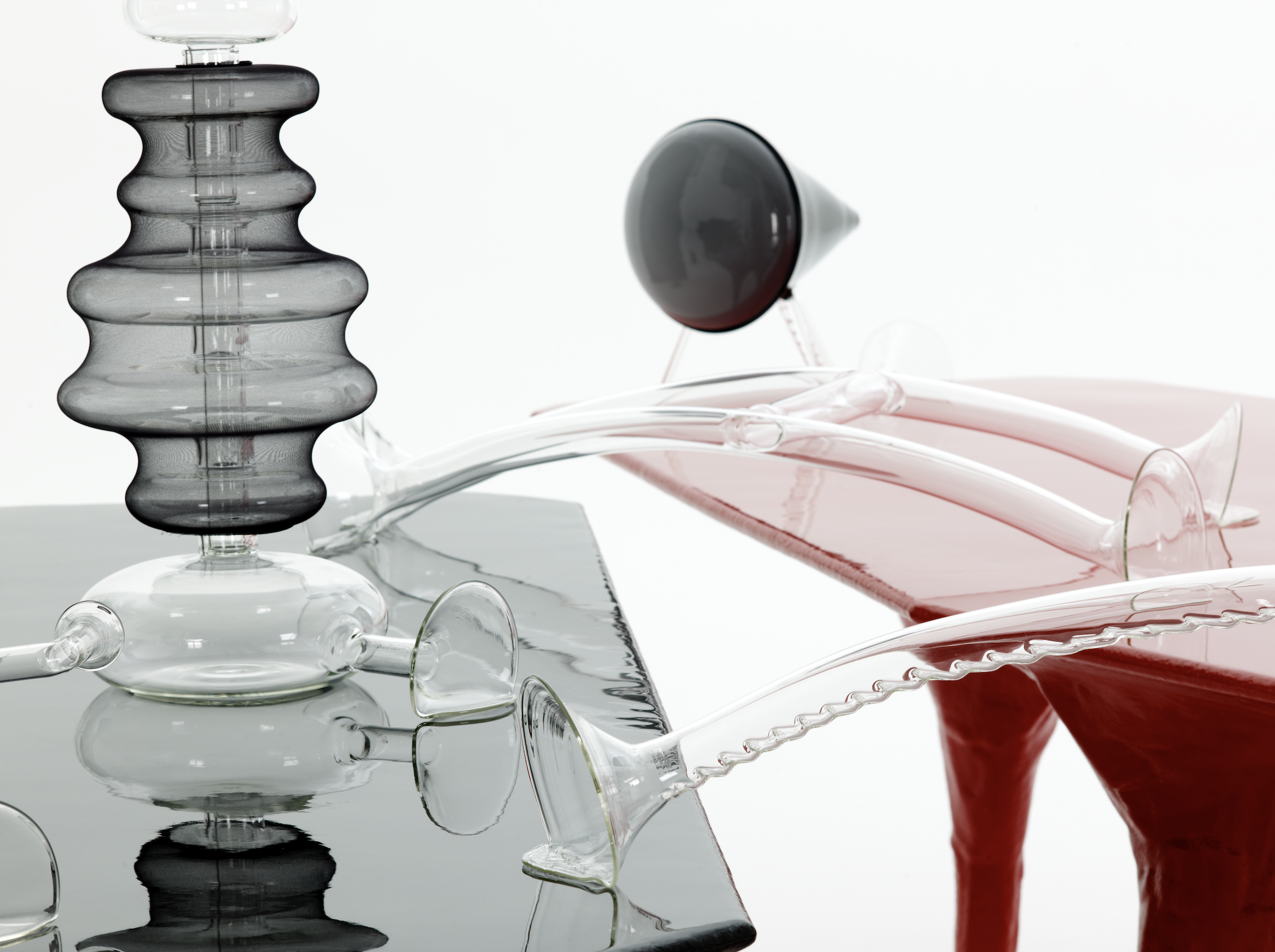 The polished surfaces of the Free Range fibreglass tables use cardboard as the base construction material to form non-geometric, organic-like furniture and are coated (as if dipped) in fibreglass. In this exhibtion they act as the foundation for an elegant sprawl of delicately formed glass objects that create an urban vista. Cinema, Airport, Love Hotel, House and Station. These Imaginary Architectures are propositions for the social, material and spiritual elements of cities. The glass 'buildings' are connected by 'glass bridges' inspired by Venice. These architectures are 'structures of anything', 'imaginary vehicles' familiar enough to be understood yet allowing us to probe, question and speculate upon the relevance and meaning of these spaces in our lives.