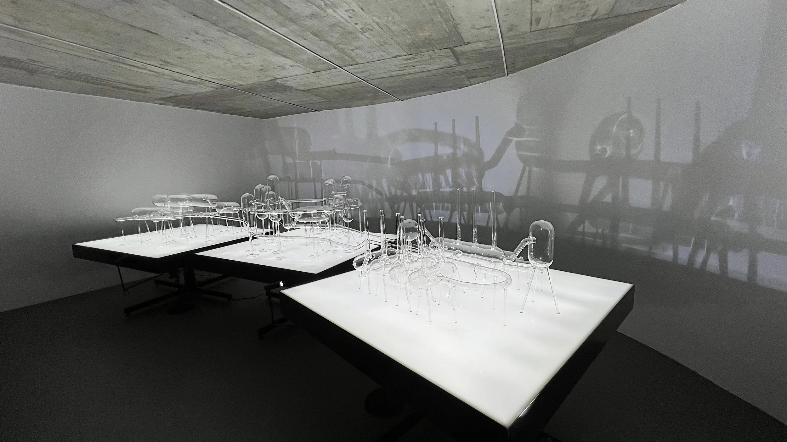 The Fallacy of the Closed System is part of the "A Rematerialisation of Systems" series. These pieces work at two levels. On one hand, at a conceptual level they explore ideas of design, perception, architecture and language. These models are spatial expressions, re-scaled ‘vehicles’ which contain familiar elements of known spaces, that prompt us to imagine what it would be like to navigate and inhabit their interiors. These pieces talk to us about the materiality of the object and our subjective approach to the spaces they describe. The fact that they are completely transparent glass pieces, allow us to project ourselves into the spaces they describe, to imagine how life would be both inside and outside, what kind of realities they allude to. On the other hand, and equally importantly, they explore their materiality investigating their sculptural dimension, the glass blowing process, the construction ideas and how these can be articulated into new aesthetic propositions and typologies in relation to architecture and design. Embracing the glass blowing process was essential to develop models that brought an impossible reality to the architectural ideas. The fact that you had to design them with a "bubble logic", transformed our own ideas of how these buildings could be constructed and shaped. It is intriguing that the process implies that the shapes, and spaces they represent, are both formed by air and later defined by the air they contain.